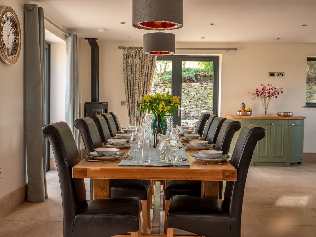 - Large kitchen–diner with bi-fold doors opening to the terrace and garden. A 12-seat dining table provides the perfect place for shared meals, private chef dinners, or a retreat workshop setting.